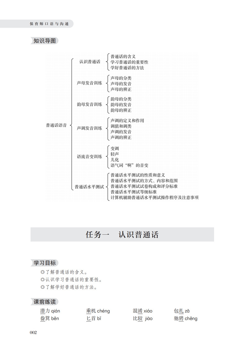 本书是幼儿保育专业学生必修的专业课程,依据教育部《职业教育专业目录(2021年)》,并参照《幼儿园工作规程》《保育员口语与沟通》《幼儿教师口语》等编写而成。该书立足保教人员的专业定位,注重幼儿保育专业的针对性,结合中等职业学校学生实际状况,以任务情境为切入点,联系保育教育实际,共分为三个模块,六个项目。主要内容包括保育师普通话语音、口语技能训练基础、保育师职业用语和沟通语;系统阐述了保育员口语的基础理论、技能技巧,力求做到理论与实践相结合、讲解与训练结合,突出实用性、指导性和操作性,以提高学生的口语表达能力。