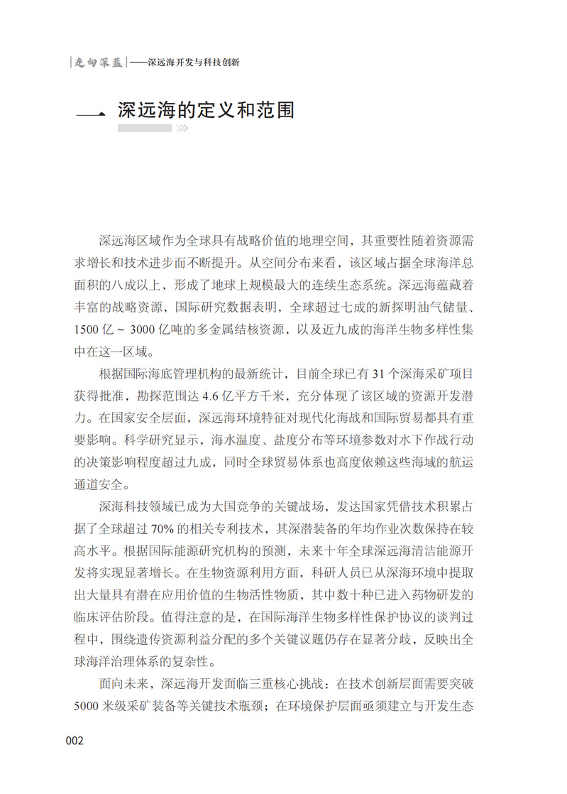 国家管辖海域以外的国际海底和公海区域面积约2.5亿平方千米的深远海占地球表面积的49%,蕴藏着多种自然资源,尚未被充分开发利用。本书介绍了《联合国海洋法公约》中有关规定,国际海底管理局的使命、任务及有关活动,国际上一些国家在深远海的一些资源勘探活动,我国参与国际海底管理局的工作情况,以及科技创新在深远海开发活动中发挥的重要作用。本书可以作为国际深远海相关领域研究人员和学习人员的资料性参考用书,也可以供广大关心这一领域的读者们在业余查找相关问题时作为资料借鉴和引用。