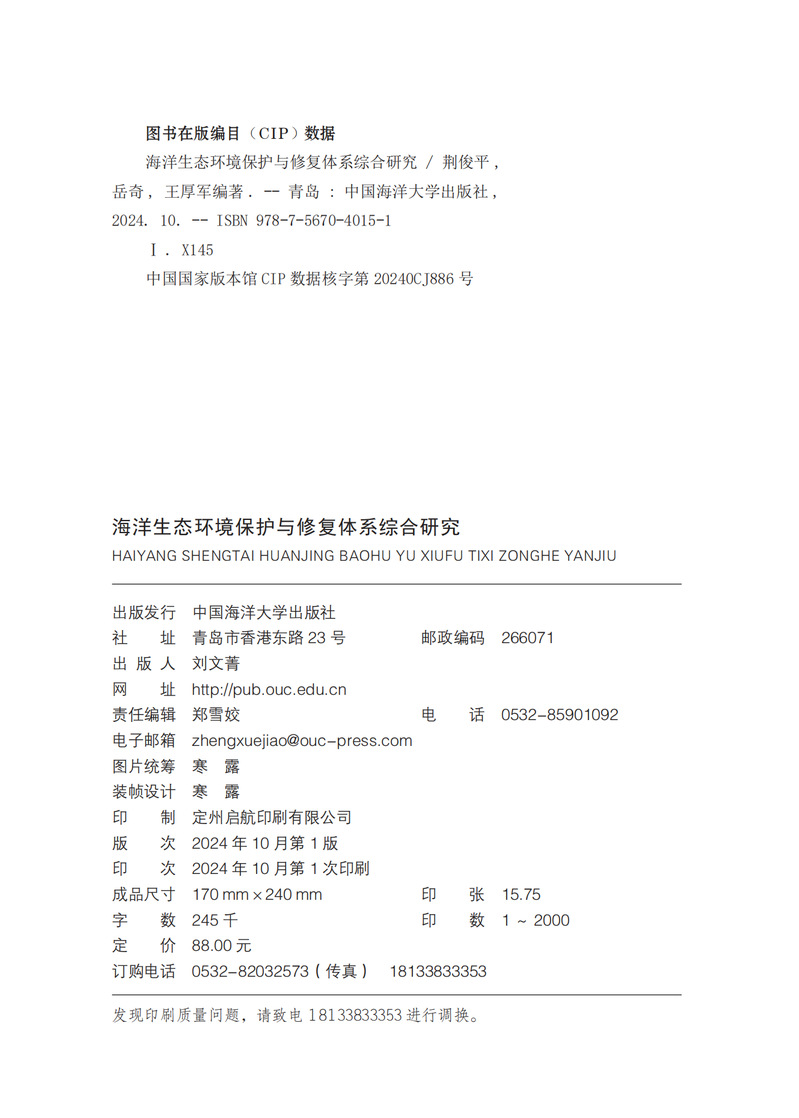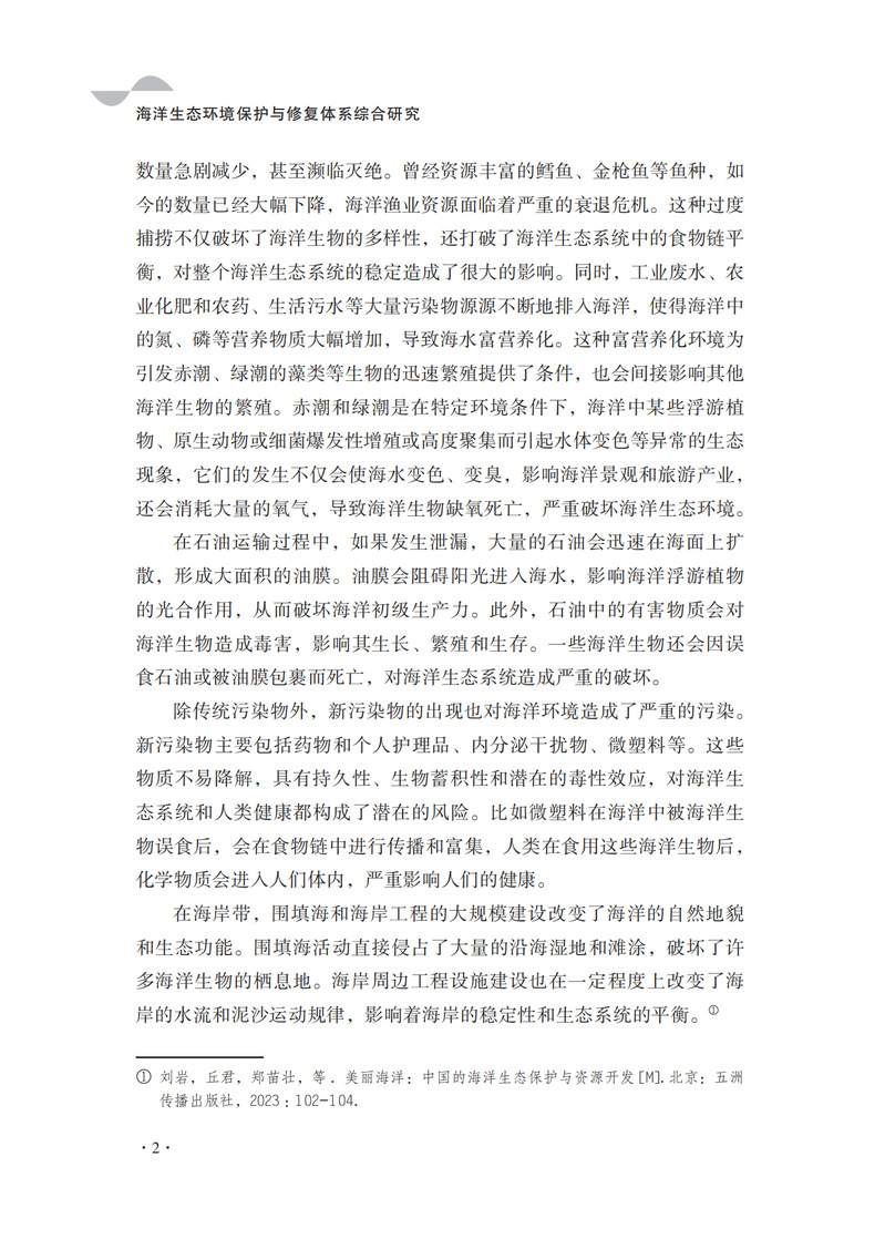 本书是一本全面探讨海洋生态环境保护与修复体系的专业书籍。本书系统介绍了海洋生态灾害的监测与防治技术,深入分析了赤潮、绿潮、海上溢油及新污染物对海洋生态的影响,并详细描述了海洋生物入侵的监测与评估方法。同时,本书着重介绍了各类海洋生态环境保护与污染控制技术,包括赤潮、绿潮、海上溢油及新污染物的应对策略,以及海水养殖污染的控制技术。本书旨在帮助读者全面了解和掌握海洋生态环境保护与修复的基础理论、前沿技术和实际应用。它不仅适用于海洋资源开发技术、海岸带资源与环境等专业的本科生和研究生学习,也可供从事海洋生态修复的工程师、管理人员和科研工作者参考。