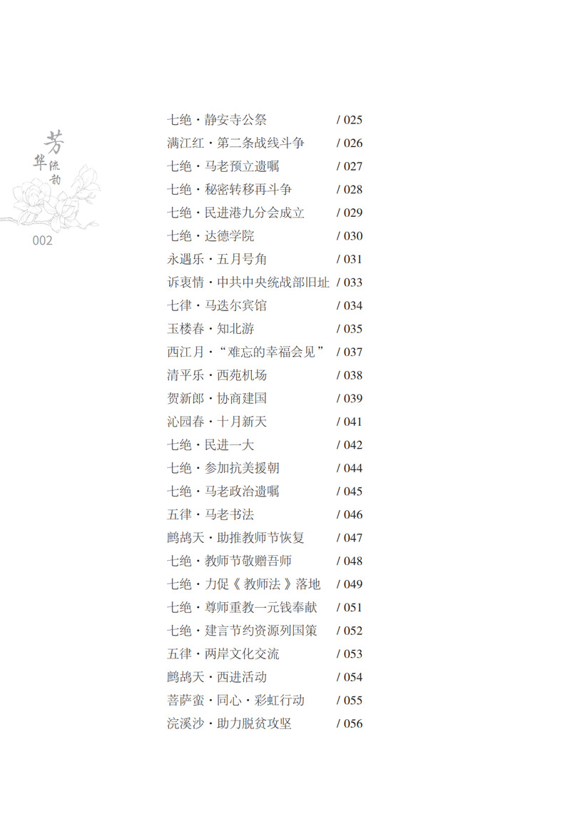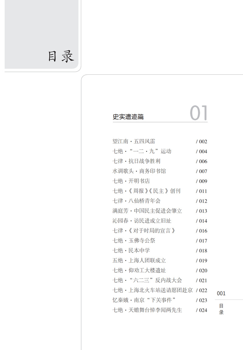 本书收录了作者近些年来创作的诗词歌曲等。其中收录了作者结合党派工作开展学习时参观中国民主促进会史实遗迹时的感怀,也有参观中国民主促进会著名人物故居时的缅怀。作者为中国诗歌学会会员、山东诗词学会会员,所创作的以古典诗词为主,也收录了少量个人创作的歌词。作者个人结合当时创作时的情境,对相关历史资料进行了收集,结合创作背景进行了说明。全书分史实遗迹篇和先贤人物篇,以及附录。诗词表达的情感正面、积极向上,诗词符合格律要求。整体质量较高。有一定的社会价值。