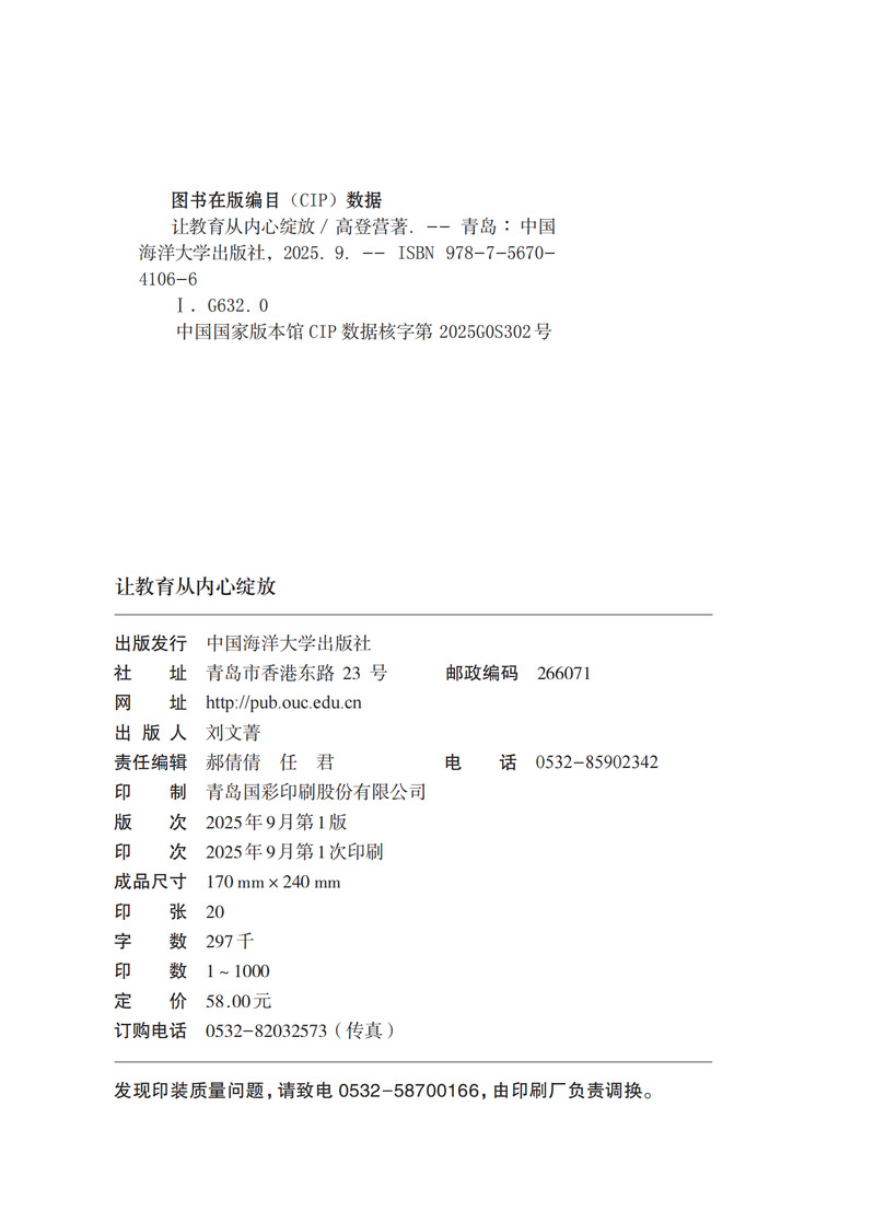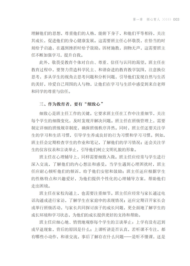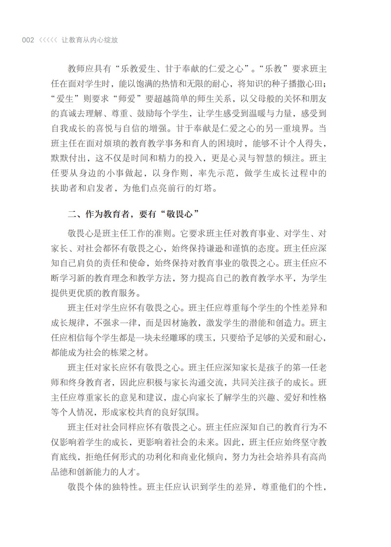 《让教育从内心绽放》一书汇集了作者多年来从事一线教育教学工作中的具体事例和经验总结,从根本上阐释“教育”即“教”和“育”的一体化结合,教师所做的工作,不仅仅是教授学生文化科学知识,更重要的是,要从内心引导学生的思想,和学生站在一起共同成长和实现个人进步。全书总共约15万字,全部是一线教师的实践总结与教学思考和感悟,凝结了作者多年的工作体会和思索,值得广大教育工作者,尤其是一线教师们参考与总结,并以此关照自己的实际工作,以期有所启发,有所借鉴,有所提高。