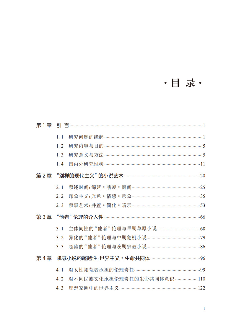 本书从小说艺术的形式和内容出发,以薇拉·凯瑟三个时期的小说为研究对象,用文本细读和症候阅读的方法,来探讨凯瑟小说美学属性的形成。本书由五章组成。第一章“绪论”梳理了研究问题的缘起、国内外研究现状、研究方法、研究内容及其研究意义。第二章从艺术形式上建构了薇拉·凯瑟小说中绵延、断裂、瞬间的叙述时间机制。第三章分析了薇拉·凯瑟小说中体现出的“他者”伦理的介入性。第四章探讨了薇拉·凯瑟小说中对“他者”文化尊重与包容的世界主义精神及其生命共同体意识。第五章总结了薇拉·凯瑟小说“别样的现代主义”的美学特征,重申了薇拉·凯瑟在美国现代主义文学中的经典地位。