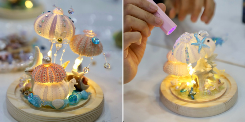 工作人员提前备好海胆壳、LED灯串、玻璃罩、胶水、配件等材料,详细讲解了海胆灯的制作步骤、技巧及注意事项,耐心解答女职工们的疑问。大家充分发挥想象力和创造力,精心搭配装饰配件,交流制作心得。现场氛围轻松融洽,充满欢声笑语。经过一番忙碌,一盏盏造型独特的海胆灯陆续诞生,散发着柔和的光芒,既承载着海洋的浪漫气息,也凝聚了女职工们的巧思与设计。