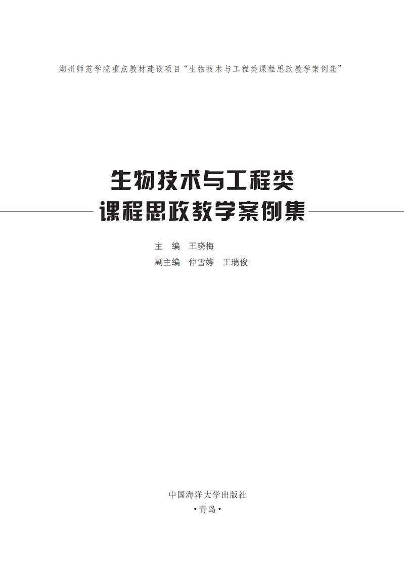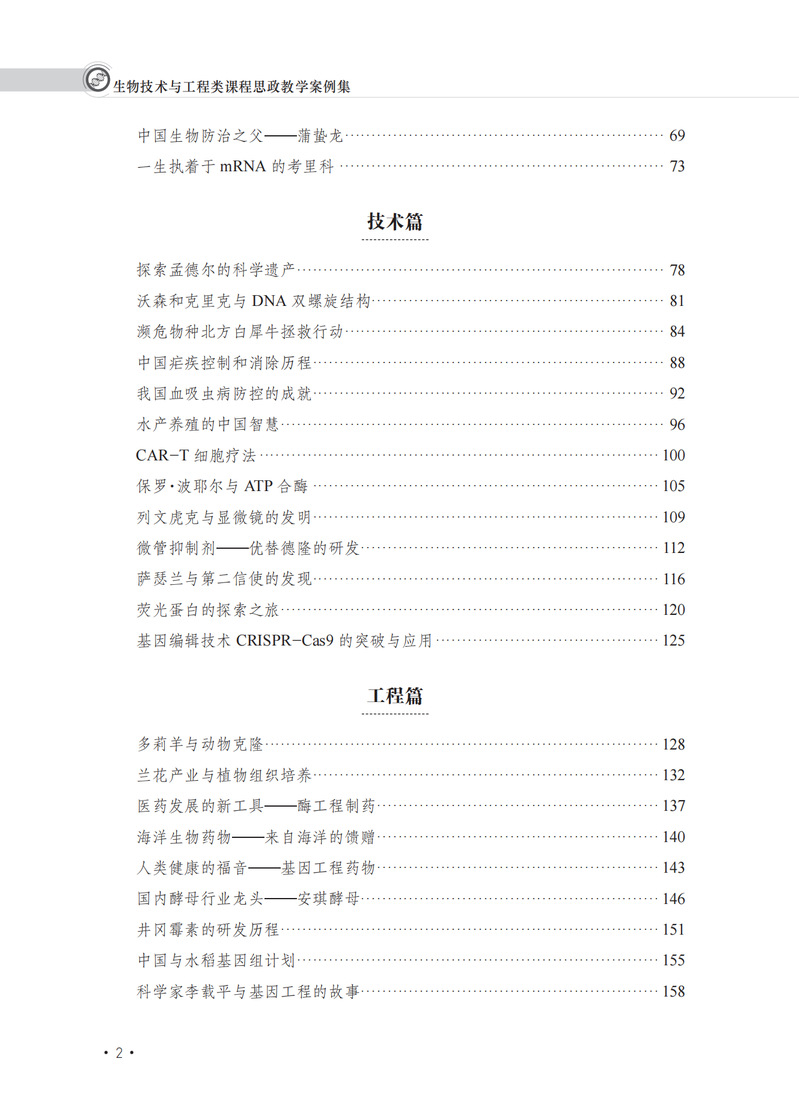 本教材选取生物技术与工程类的专业核心课程有生物化学、细胞生物学、分子生物学、遗传学、微生物学,以及基因工程、发酵工程、生物反应工程、生物分离工程、生物工程设备等,还有农业、医学、化学、海洋科学等领域的应用生物技术和工程相关课程。编排设计包括“生物科学基础”“生物工程”“应用生物技术”三大类领域,编写包括“人物类”“技术类”“工程类”和“事物类”等模块共60个案例。每个案例以“案例呈现”“案例分析”“教学建议”和“参考资料”展开。这些模块,主要体现我们要传递的工匠精神、家国情怀、责任担当、专业精神、职业道德、安全意识、环保意识等,力求以潜移默化的方式达到知识、思想与能力共同提升的教学效果。