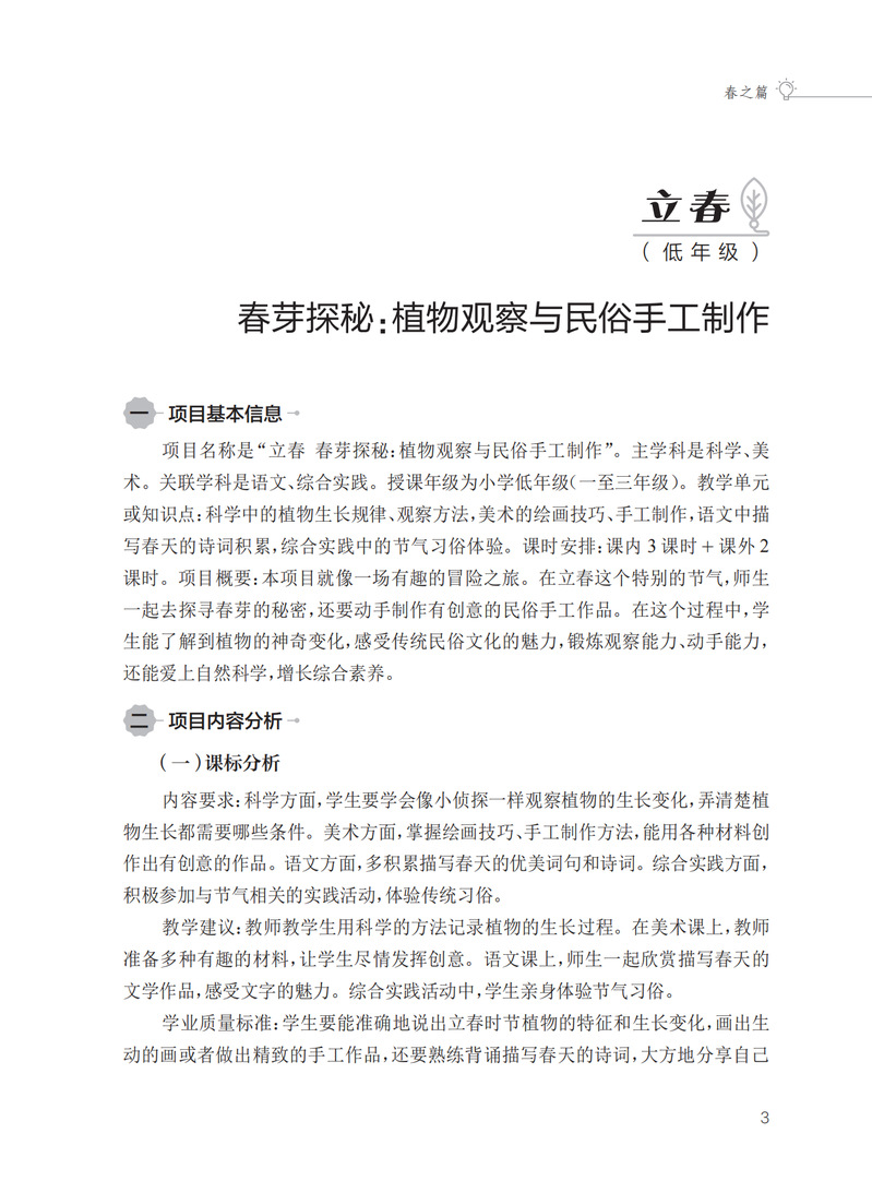 本书是深入探讨以项目式班本课程促进学生多元能力发展的教育实践指南。本书以二十四节气为脉络,为读者呈现了丰富多样、生动有趣的学生项目案例。每个节气都巧妙融入了独具特色的内容,项目涵盖艺术、科学、文化、体育、环保、社会实践等多个领域,旨在全面激发学生的观察能力、动手能力、思维能力、沟通协作能力、文化传承能力等多元能力。通过对每个项目的课程思考、实施过程、成果展示和反思总结等方面的详细阐述,为教育工作者提供了极具参考价值的课程设计思路和实践方法,助力教师打造充满活力和教育意义的班本课程,促进学生在节气的轮回交替中实现多元能力的觉醒和全面发展。