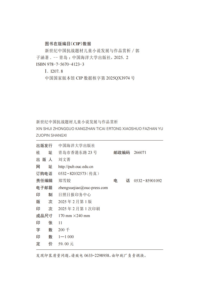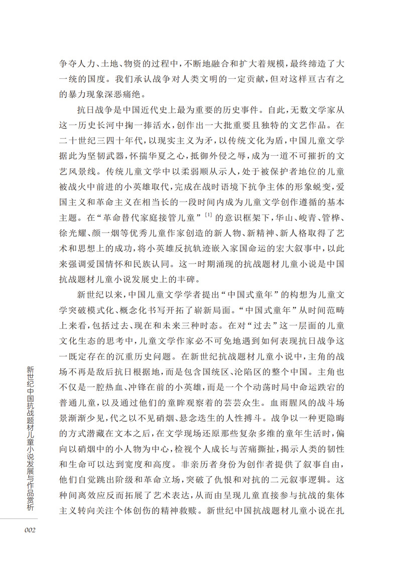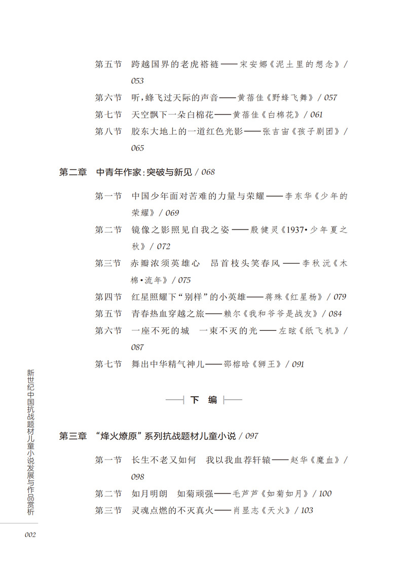 2025年是中国抗日战争胜利暨世界反法西斯胜利八十周年。本书籍以时间为序,回顾新世纪以来中国抗战题材儿童小说创作历程,通过对这一时期重点作品内容概述和审美赏析,“一书一评”艺海拾贝式勾勒这一类型化创作的发展新变,揭示这一经久不衰的命题所具有的文化意义和社会意义。希望此书帮助青少年鉴别和挑选作品,化身为其穿越历史迷雾深海的桨舵,从而汲取理想奋斗的精神能量,对抗遗忘,热爱和平,反思战争,感念当下。本书具有一定的文学价值和市场价值。