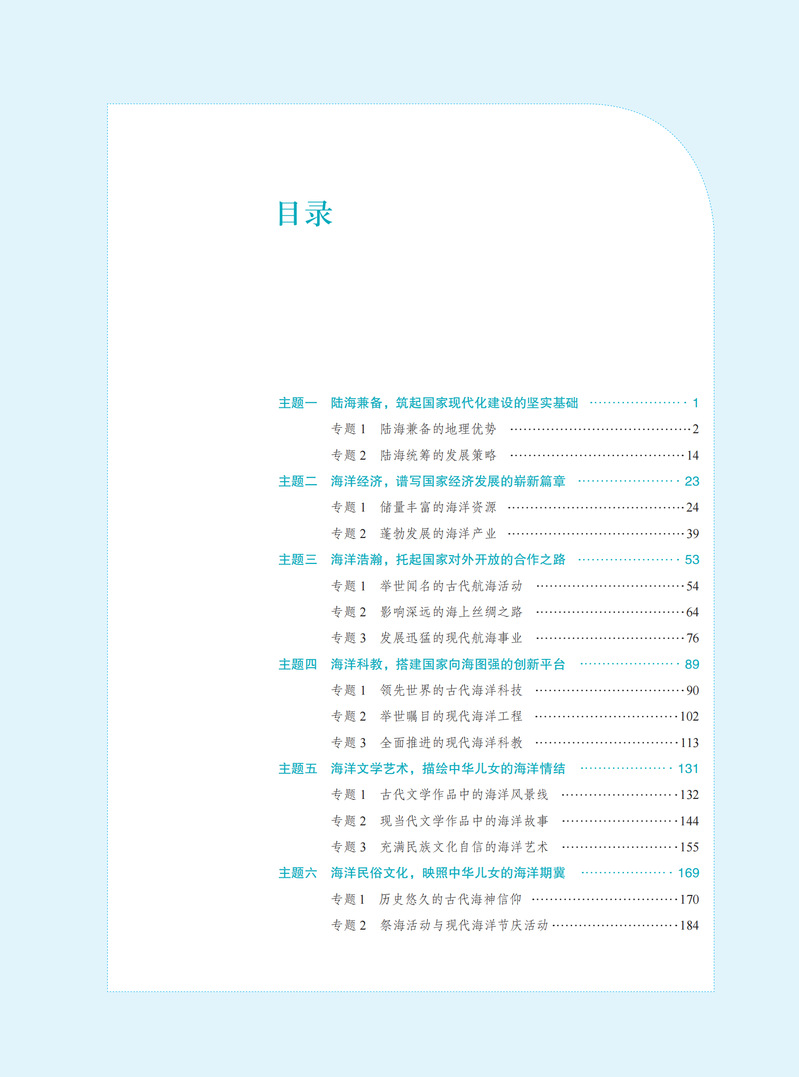 《海洋中国》是一本海洋通识教育教材,共包括陆海兼备的地理优势与陆海统筹的发展战略、储量丰富的海洋资源与蓬勃发展的海洋产业、实力超强的古代大航海与发展迅猛的现代航海事业、领先世界的古代海洋科技与举世瞩目的现代海洋工程、海味浓郁的文学作品与美轮美奂的海洋艺术、历史悠久的古代海洋信仰与充满现代气息的海洋节庆、神圣不可侵犯的海洋权益与威武雄壮的人民海军、面临现实威胁的全球海洋与海洋治理的中国方案等8个主题20个专题。