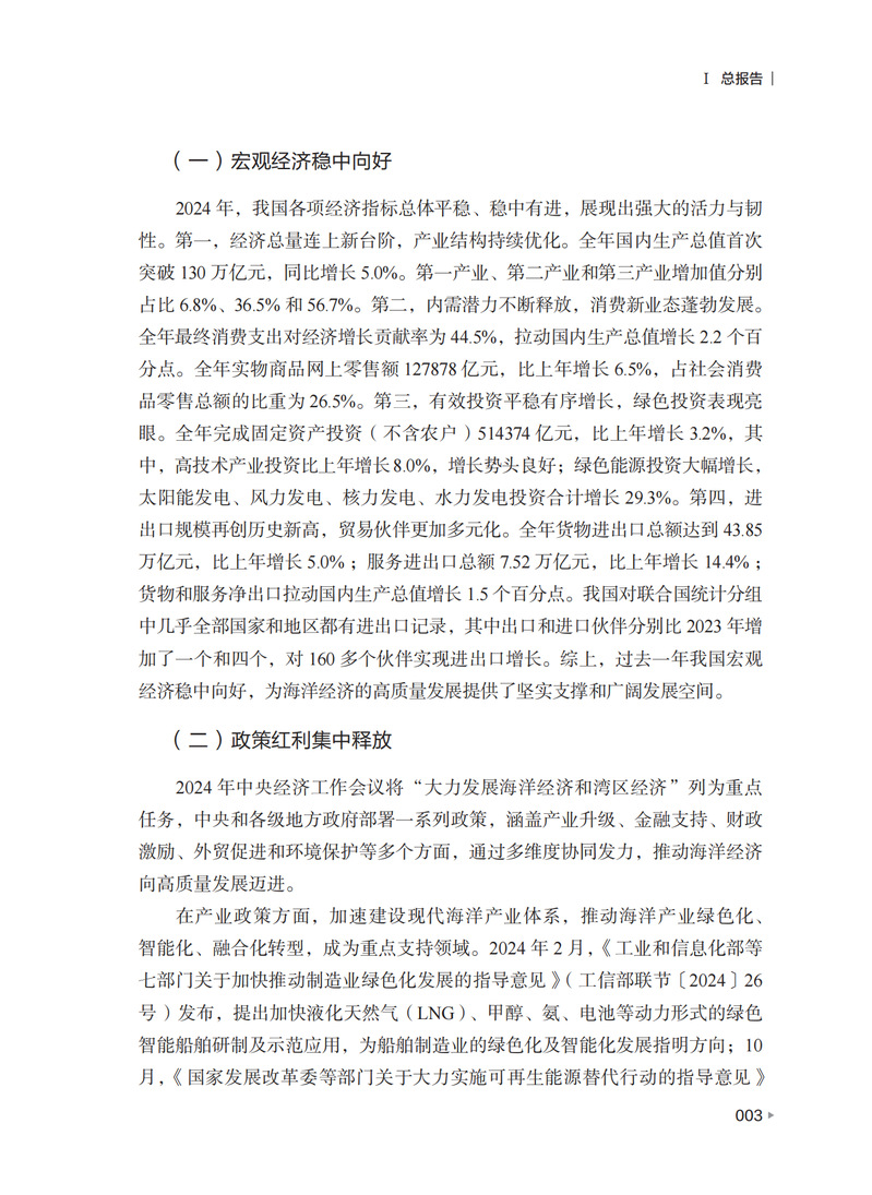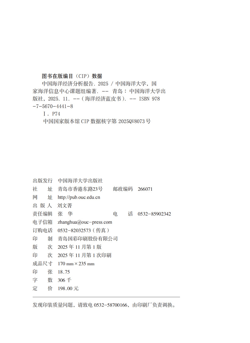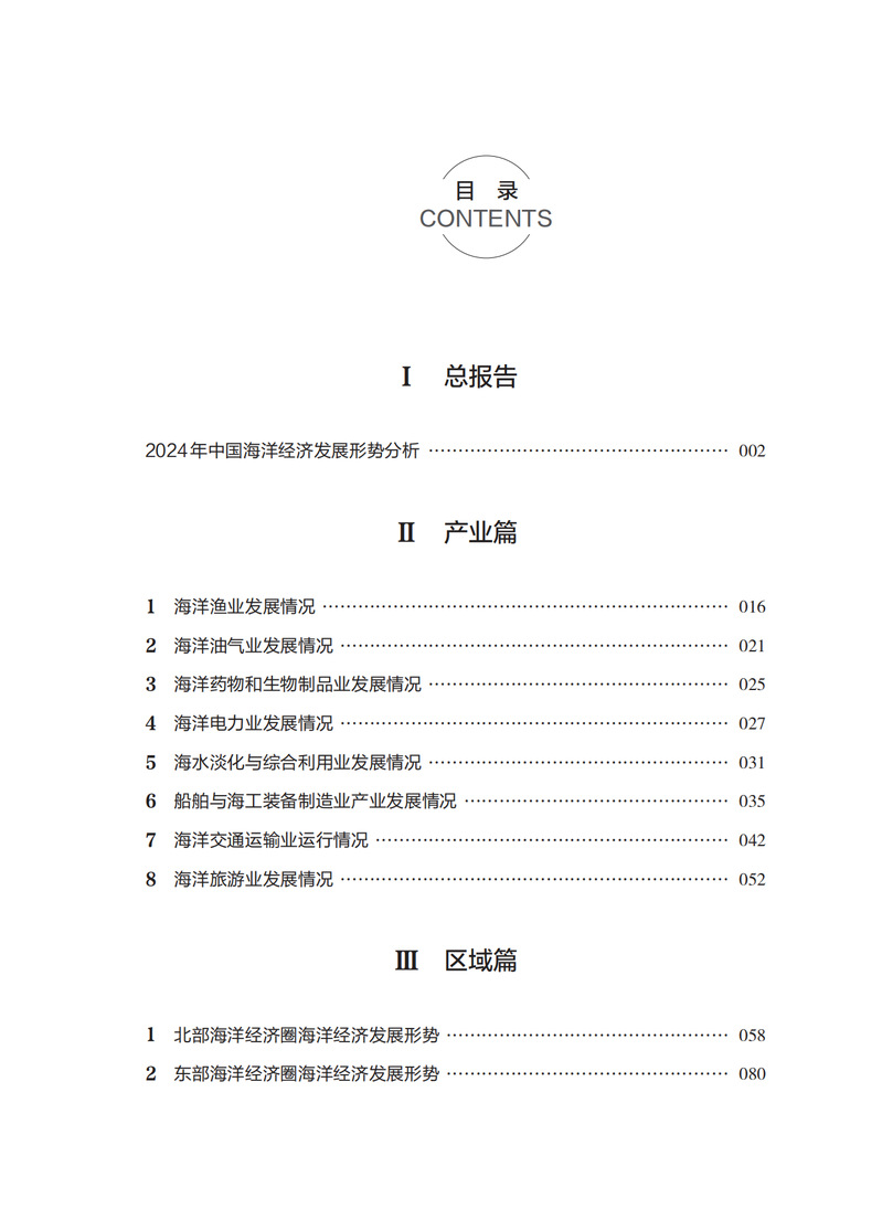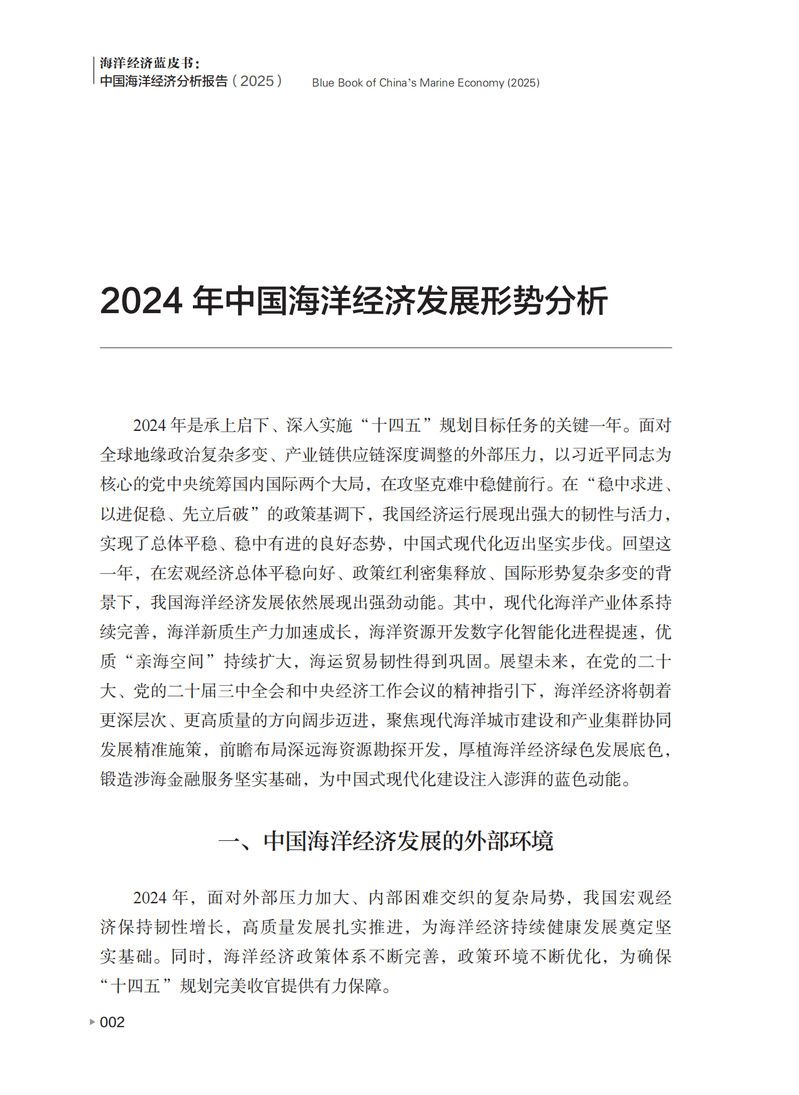 《海洋经济蓝皮书:中国海洋经济分析报告(2025)》一书包括四个篇章:第一篇为总报告,分析了2024年中国海洋经济发展形势。第二篇为产业篇,总结2024年我国海洋渔业、海洋油气业等海洋产业发展情况;第三篇为区域篇,分析了北部海洋经济圈、东部海洋经济圈、南部海洋经济圈和粤港澳大湾区海洋经济发展形势。第四篇为专题篇,以“完善促进海洋经济发展体制机制”为主旨,重点探讨海洋新质生产力、海洋产业未来发展新赛道以及我国海洋经济“四链融合”发展现状、问题挑战与对策建议等问题。