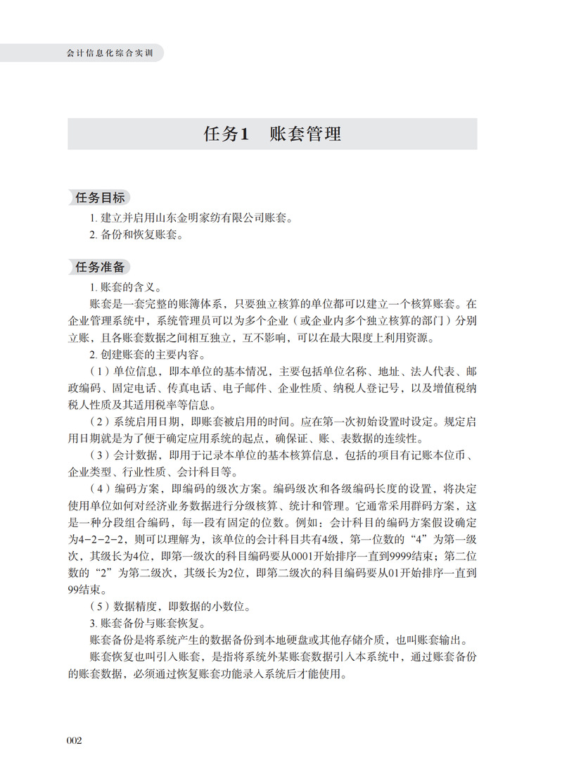 全书内容包括系统管理、基础设置、期初数据管理、日常业务处理、期末处理、申报纳税、报表管理、发票管理等八个项目,以一家工业制造企业为例,重点介绍了各项目内所包含的各个任务的任务目标、任务准备、任务分析、任务实施、任务工单等模块,内容全面、实用、新颖。本书编写体例安排合理,采用活页式。教材编写时还结合“1+X”智能财税证书和技能比赛中的相应内容,符合中职学校注重技能培养的要求。本书既可作为中职院校的实训、高考辅导用书,也可作为各类会计信息化大赛(尤其是中职院校会计类大赛)的参考教材。