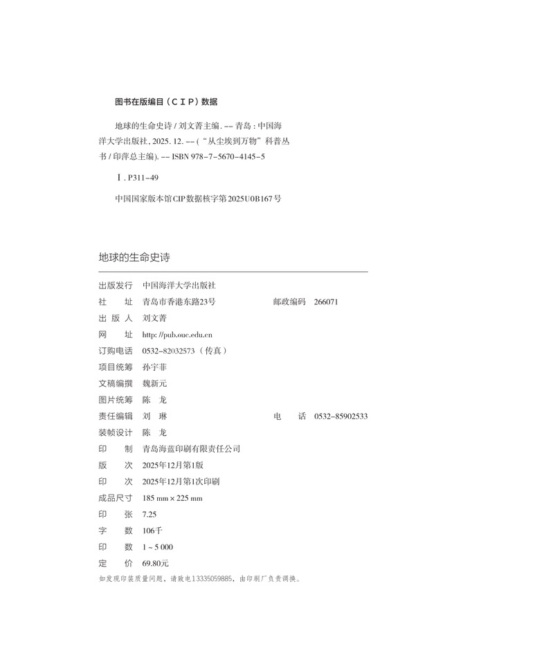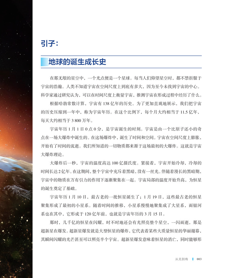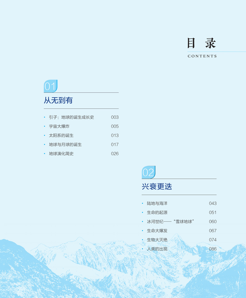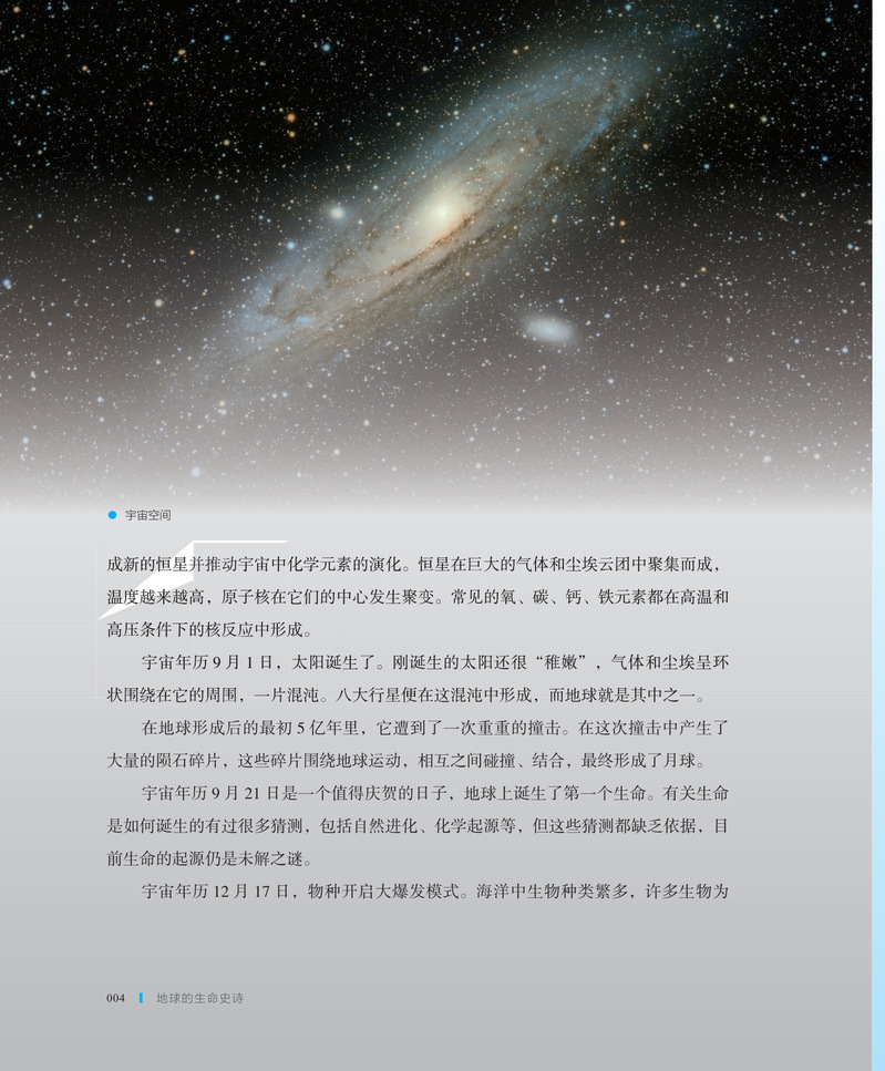 本书分为两大部分,第一部分从无到有,介绍了从冥古宙、太古宙、远古宙到显生宙,地球生命的起源、变化及发展,内容涉及宇宙大爆炸、太阳的形成、地球和月球的诞生、海洋与陆地的出现;第二部分兴衰更迭,介绍了地球历史大事件,内容涉及大氧化事件、超级大陆形成等地质事件,寒武纪生物大爆发、奥陶纪生物多样化、泥盆纪晚期生物大灭绝等生命演化事件。