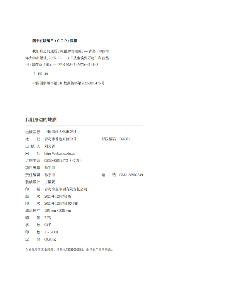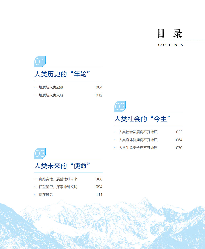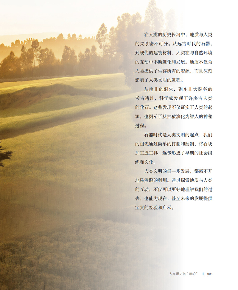 本书共分为三个篇章。上篇从人类历史的地质“年轮”切入,以地质与人类起源的关系为主线,为读者勾勒出一个丰富多彩的地质历程。中篇聚焦于人类社会的地质“今生”,深入挖掘与当今社会直接相关的能源矿产、宝石、健康和安全等方面的地质知识,为读者提供更直观的实用信息。下篇以人类未来的地质“使命”作为结尾,引导读者思考人类与地质之间的紧密联系。全书兼具知识性与趣味性,使读者在轻松阅读中深刻理解身边地质的奇妙之处。
