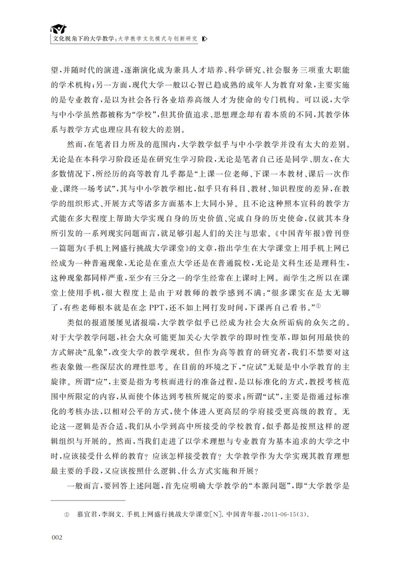 本书使用“大学教学文化”概念对大学组织与教学之间的内在关系进行了考察 ,从文化角度分析了大学的价值追求、思维模式与文化旨趣对教学活动的影响。除绪论外,本书包括以下几个部分:大学教学与教学文化、大学教学文化的价值观照、大学教学文化的历史轨迹、我国大学教学文化的现实省思、我国大学教学文化的创新。本书的重点在于从“传统—现代”的本体论认知和“价值理性—工具理性”的价值论认知出发,分析了大学教学文化的基本模式。本书的读者对象为从事高等教育研究及实务工作的各类人员,以及相关专业学生。